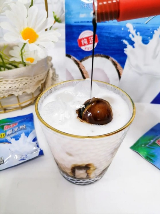 ?2.杯中放入冰塊,倒入溶解後(hòu)的(de)椰奶(nǎi)